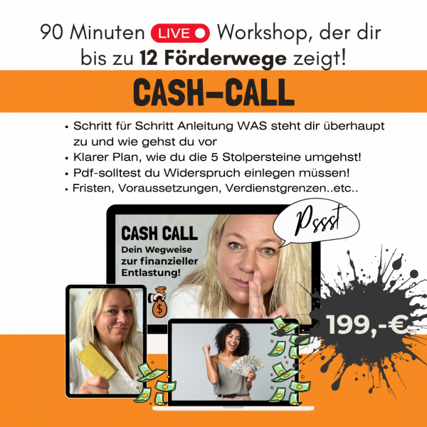 Im ADHS Cash Call, zeige ich dir live, wie du an finanzielle Mittel kommst, die dir und deinem Kind zustehen – damit Geld dich nie wieder daran hindert, das Richtige zu tun.